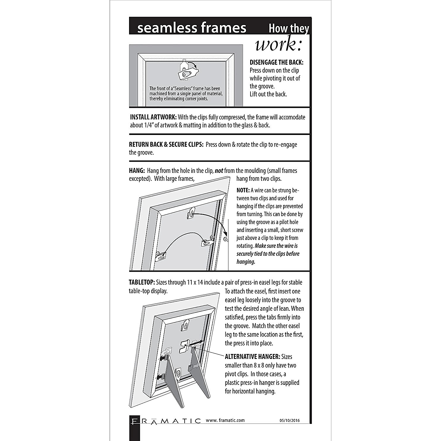 Back to results Scroll Items 4565 of 11360 Family Members 5"x7" - /8x10 METRO White Matted $36.95 10"x10" - METRO White $32.95 11"x14" - /16x20 METRO White Matted $62.95 Main view Product Details Framatic The METRO Seamless white wood Matted 11x14/8x10 frame by Framatic® — Framatic® Metro frames offer a clean and seamless look with no corner joints. Instead of joining cut pieces of frame moulding, Framatic® laser-cuts a ¼" thick panel of MDF into a frame. Wood moulding is attached to the back of the frame to allow room for backing and up to 5/16" thick artwork. The frame is painted after it is assembled for a simple, modern look. Each Metro frame features an easy-to-use pivot-clip backing, a neutral pH white-core mat and enough room for double mats and thick artwork. Seamless construction: no corner joints Pivot clips let you easily lock the backing in place Room for multiple mats & thick Artwork Neutral PH White core mat Use pivot clips to hang frame vertically or horizontally Frame displays an 8"x10" print with mat; an 11x14" without mat. Wall mount only with its easy to hang mount.By Framatic®. The METRO Seamless white wood Matted 11x14/8x10 frame by Framatic® Model #42002183 List $50.00 You pay $38.95 In stock Can be shipped today [?] Your Price Match is Active Your request for a price of $0.00 for a minimum quantity of has been accepted. You have [time] left to purchase this item for $0.00 instead of $38.95 each. Find a Lower Price? We BEAT All Authorized Retailers [?] FEATURESDisplays:8"x10"Material:Wood (mdf/engineered)Finish:WhiteOccasion:Business & office, Celebrating Travels, Home decoratingStyle:Classic, Contemporary, Minimal, TraditionalOrientation:BothBrand:FramaticDisplay Type:Wall Only This item ships in its own box SHARE THIS ITEM Share on Facebook