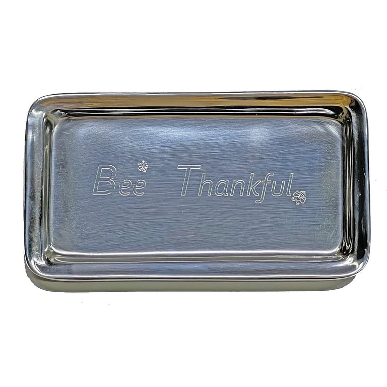 Main view Product Details Mariposa® BEE THANKFUL SIGNATURE SIGNATURE 7in TRAY by Mariposa® — Give the gift of celebration with the BEE THANKFUL 7" x 4" Signature Tray. This timeless treasure is great for entryways, dressers and desktops. Handcrafted from 100% recycled, buffed-until-brilliant aluminum. Beautifully boxed in a Mariposa Gift Box - makes gifting easy! SendAFrame stocks the entire Mariposa® picture frame line - and related Brand and Design styled items like this special tray. Important Note: Mariposa items are hand engraved. Your piece may differ slightly from the photo. FeaturesImportant Note: Mariposa items are hand engraved. Your piece may differ slightly from the photo. BEE THANKFUL SIGNATURE SIGNATURE 7in TRAY by Mariposa® Mariposa® FALL CELEBRATION Savings - Buy More / Save More * Add this item to your cart for the full details of this promotion. Conditions may apply. Model #13176178 $36.00 only 3 left, order soon. In stock Can be shipped today [?] Your Price Match is Active Your request for a price of $0.00 for a minimum quantity of has been accepted. You have [time] left to purchase this item for $0.00 instead of $36.00 each. Find a Lower Price? We BEAT All Authorized Retailers [?] FEATURESMaterial:AluminumFinish:SilverOccasion:Easter, Friendship, Thanksgiving, Thank-Motivate-Reward, Weekend Host GiftsStyle:Contemporary, Eco-Friendly-Recycled, Modern, Santa Fe, Shabby Chic, Sports & leisure, Words & whimsy, Expressions > ready madeBrand:Mariposa®Display Type:not applicable n/a Approx. Overall Dimensions:7"x4"x1/2" This item ships in its own box SHARE THIS ITEM Share on Facebook