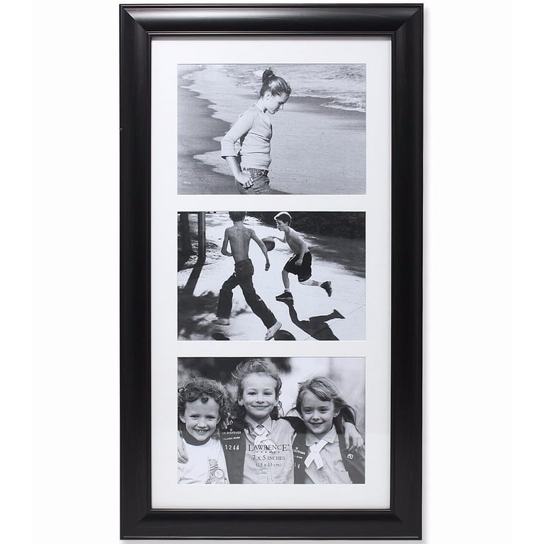 Main view Angled Reverse Product Details Lawrence Frames® Black Collage Displays (3) 5x7 Matted Photos — Pre-matted collage in ebony black is a great presentation for three (3) 5"x7" photos. in a very flattering design.Features a hardwood black-stained stepped moulding. Soft white matted to showcase your prints.Frame includes wall mounts for easy hanging, either vertical or horizontal. Acid-free backing for life-time care of your prints. Glare resistant glass lens.Crafted by Lawrence®. Black Collage Displays (3) 5x7 Matted Photos Model #48068482 List $47.00 You pay $40.95 In stock Can be shipped today [?] Your Price Match is Active Your request for a price of $0.00 for a minimum quantity of has been accepted. You have [time] left to purchase this item for $0.00 instead of $40.95 each. Find a Lower Price? We BEAT All Authorized Retailers [?] FEATURESDisplays:5"x7"Material:Wood (full grain)Finish:BlackOccasion:Birthday, Business & office, Friendship, Home decorating, Housewarming, Sweet 16, Team & coach gifts, Thank-Motivate-Reward, Celebrating TravelsStyle:Architectural, ContemporaryOrientation:BothBrand:Lawrence Frames®Display Type:Wall Only Approx. Overall Dimensions:18 1/2"x10 1/2"x5/8" This item ships in its own box SHARE THIS ITEM Share on Facebook