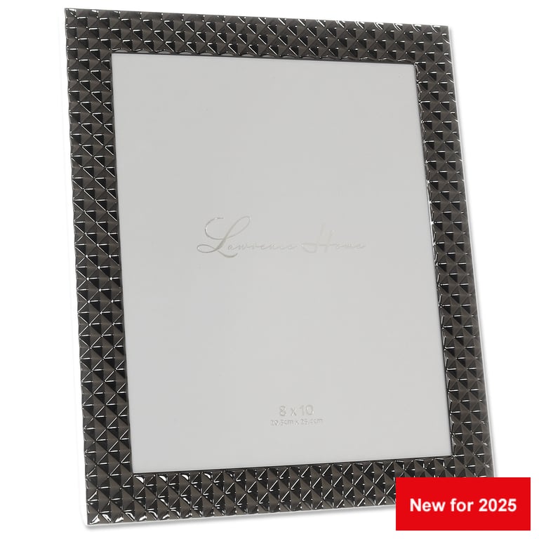 Main view Product Details Lawrence Frames® DIAMONDS Hematite-Finish 8x10 frame — Decorative black metal diamond design picture frame. Heavy weight cast metal picture frame is made with exceptional workmanship. Decorative hammered effect picture frame High quality black velvet slide-in channel backing Vertical or horizontal tabletop display or can be hung on a wall with installed hangers Wipe clean with dry cloth, glass included Easy load channel back design Individually boxed By Lawrence Frames®.. DIAMONDS Hematite-Finish 8x10 frame Model #751148089463 List $33.00 You pay $21.95 This item IS in stock and can be expected to ship 01/20/2026 Your Price Match is Active Your request for a price of $0.00 for a minimum quantity of has been accepted. You have [time] left to purchase this item for $0.00 instead of $21.95 each. Find a Lower Price? We BEAT All Authorized Retailers [?] FEATURESDisplays:8"x10"Material:Metallic (all)Finish:Black, Gray/CharcoalOccasion:Birthday, Business & office, Friendship, Home decorating, Thank-Motivate-RewardStyle:Contemporary, Sophisticated, Unique | LimitedOrientation:BothBrand:Lawrence Frames®Display Type:Desktop or Wall This item ships in its own box SHARE THIS ITEM Share on Facebook