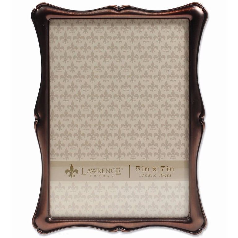 Main view Angled Reverse Product Details Lawrence Frames® Oil Rubbed BRONZE 5x7 frame — ROMANCE is a scallop shell design classic, beautifully crafted oil rubbed bronze frame. Frame holds a 5"x7" print. Features glare resistant glass lens and hardboard backing. Crafted by Lawrence®, fine frames for generations. Oil Rubbed BRONZE 5x7 frame Model #751148070164 List $28.00 You pay $23.95 This item IS in stock and can be expected to ship 01/21/2026 Your Price Match is Active Your request for a price of $0.00 for a minimum quantity of has been accepted. You have [time] left to purchase this item for $0.00 instead of $23.95 each. Find a Lower Price? We BEAT All Authorized Retailers [?] FEATURESDisplays:5"x7"Material:Metallic (all)Finish:BronzeOccasion:Celebrating Travels, Grandparent`s Day, Home decorating, RomanticStyle:Classic, Romantic, Sophisticated, TraditionalOrientation:BothBrand:Lawrence Frames®Display Type:Desktop or Wall Approx. Overall Dimensions:5 7/8"x7 11/16"x11/16" This item ships in its own box SHARE THIS ITEM Share on Facebook