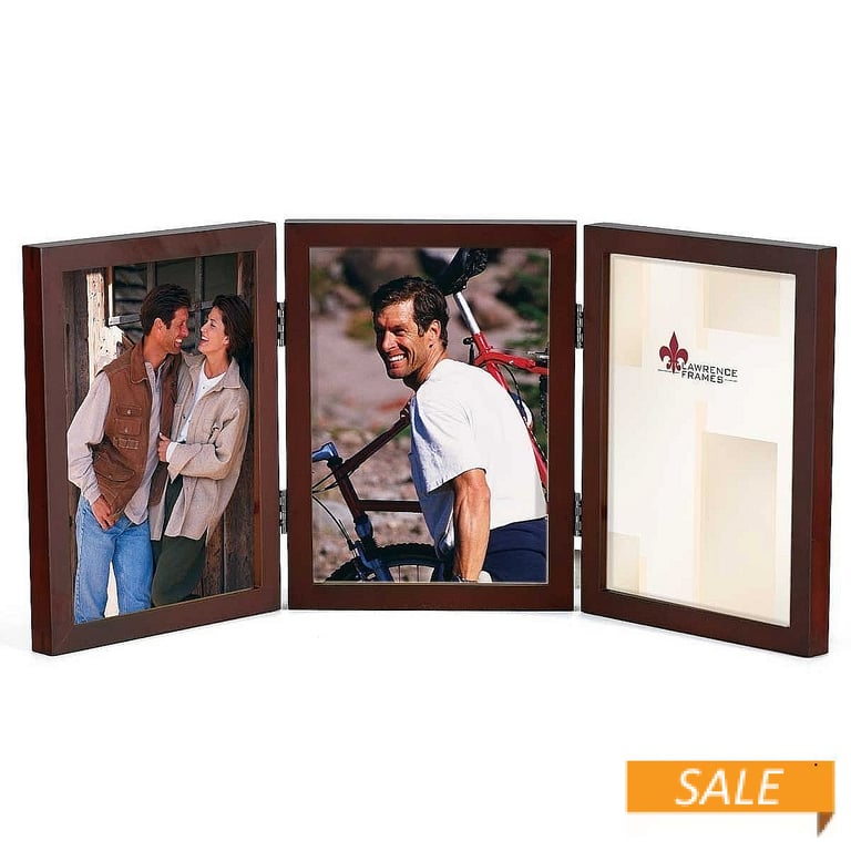 Product Details Lawrence Frames® Dark walnut-stain hinged 4x6 triple — This wood picture frame is the same you will find in studios and galleries and is a perfect frame for simply and elegantly framing important photos. It is a high quality fine grained wood frame joined in the corners with a professional "spline" joint. Moulding is approximately ½". Glare resistant glass lenses. Quality brass hinges for smooth action. For tabletop display only. Dark walnut-stain hinged 4x6 triple Model #751148055680 List $37.00 You pay $17.90 In stock Ships next business day [?] Your Price Match is Active Your request for a price of $0.00 for a minimum quantity of has been accepted. You have [time] left to purchase this item for $0.00 instead of $17.90 each. Find a Lower Price? We BEAT All Authorized Retailers [?] FEATURESDisplays:4"x6"Material:Wood (full grain)Finish:BrownOccasion:Birthday, Business & office, Celebrating Travels, Corporate gifts, Grandparent`s Day, Home decorating, Weekend Host Gifts, Housewarming, Retirement, Teacher giftsStyle:Classic, Contemporary, Traditional, Architectural, MinimalOrientation:Vertical OnlyBrand:Lawrence Frames®Display Type:Desktop Only This item ships in its own box SHARE THIS ITEM Share on Facebook
