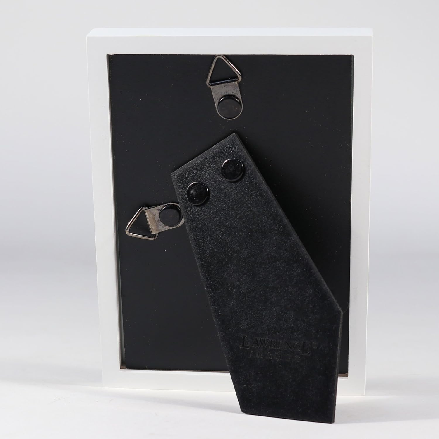 Main view Product Details Lawrence Frames® White square-corner frame by Lawrence® — Our lovely, solid WHITE frame is elegant and an easy style to decorate with.Constructed of matched varnished hardwoods with tailed corners and exact fitting back. Frame edge is a very contemporary ½" all-around.Dual easel for landscape or portrait tabletop use; wall mounting hooks included. Glare resistant glass lens.This is a classic style at a great price. Quality crafted by Lawrence Frames®. White square-corner frame by Lawrence® Model #751148067003 List $15.00 You pay $10.95 In stock Ships next business day [?] Your Price Match is Active Your request for a price of $0.00 for a minimum quantity of has been accepted. You have [time] left to purchase this item for $0.00 instead of $10.95 each. Find a Lower Price? We BEAT All Authorized Retailers [?] FEATURESDisplays:3.50"x5"Material:Wood (full grain)Finish:WhiteOccasion:Birthday, Business & office, Congratulations, Craft Projects, Home decorating, Teacher gifts, Team & coach gifts, Thank-Motivate-RewardStyle:Classic, Architectural, MinimalOrientation:BothBrand:Lawrence Frames®Display Type:Desktop or Wall This item ships in its own box SHARE THIS ITEM Share on Facebook