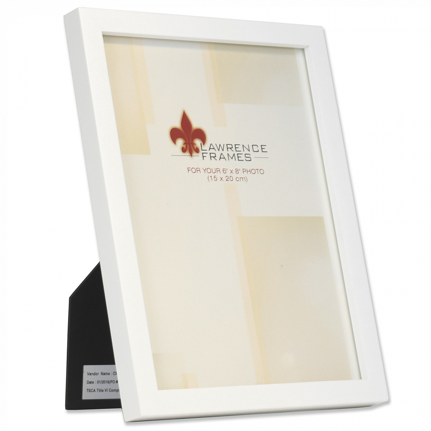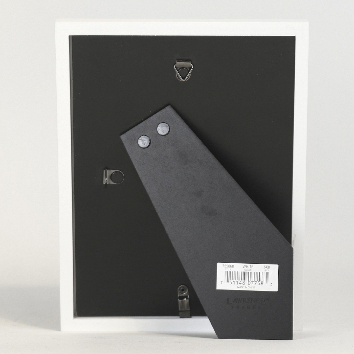 Main view Product Details Lawrence Frames® White square-corner 6x8 frame by Lawrence® — Lovely, solid WHITE frame is elegant and an easy style to decorate with.Constructed of matched varnished hardwoods with tailed corners and exact fitting back. Frame edge is a very contemporary ½" all-around.Dual easel for landscape or portrait tabletop use; wall mounting hooks included. Glare resistant glass lens.This is a classic style at a great price. Quality crafted by Lawrence Frames®. White square-corner 6x8 frame by Lawrence® Model #751148077583 List $22.50 You pay $17.95 In stock Ships next business day [?] Your Price Match is Active Your request for a price of $0.00 for a minimum quantity of has been accepted. You have [time] left to purchase this item for $0.00 instead of $17.95 each. Find a Lower Price? We BEAT All Authorized Retailers [?] FEATURESDisplays:6"x8"Material:Wood (full grain)Finish:WhiteOccasion:Birthday, Business & office, Congratulations, Craft Projects, Home decorating, Teacher gifts, Team & coach gifts, Thank-Motivate-RewardStyle:Classic, Architectural, MinimalOrientation:BothBrand:Lawrence Frames®Display Type:Desktop or Wall Approx. Overall Dimensions:6 5/8"x8 5/8"x11/16" This item ships in its own box SHARE THIS ITEM Share on Facebook