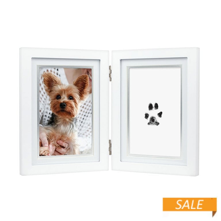 This classic white, wooden shadowbox frame has two panels to display your adorable dog or cat’s paw print and an adorable 4"x6" photo.