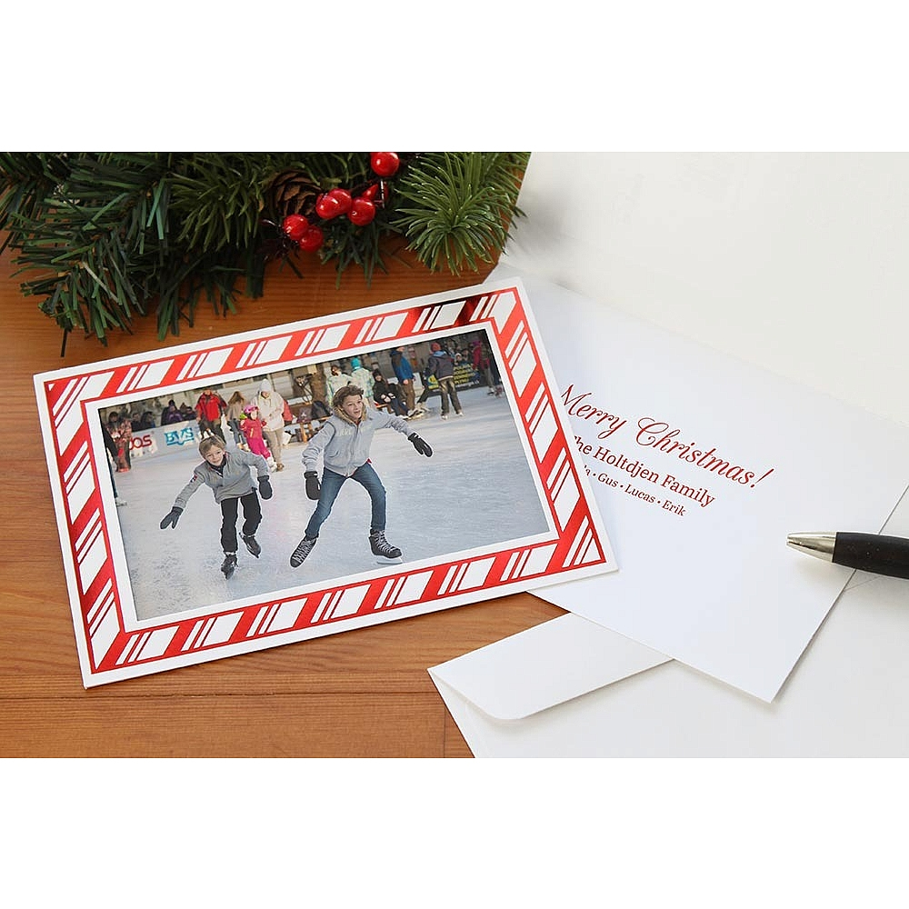 Back to results Scroll Items 5820 of 11091 Main view Product Details Collectors Gallery Embossed CANDY CANE<br>premium photo insert Holiday Card (sold in 10s) — Inside Greeting: blankA white card with red foil candy cane design. Simply slide your picture behind the window opening to create an instant personalized photo card. Cards are full-color throughout. The front color carries through to the inside and back of the card. Our Snow White card is made from a bright white paper stock. Black, metallic gold or any color ink looks best for writing inside. Blank inside (optional foil imprinting) Photo Insert Cards overall measure 5"x7" with 3½"x5½" window cover opening Side-load construction for fast assembly with your prints Accommodate vertical or horizontal 4"x6" prints Envelopes included with your order. Additional envelopes available - see ACCESSORIES Can be used as an instant mat in 5"x7" frames- or add to your scrapbooking albums Folders are individually priced; sold in 10's. Made in America. Personalizing available - ADD item to CART to see link, including custom graphics and options. Embossed CANDY CANE premium photo insert Holiday Card (sold in 10s) Model #021352011032 List $25.00 You pay $18.90 ( set of 10 / $1.89 ea ) This item can be expected to ship by 01/26/2026. Order now by clicking ADD TO CART (below); you are only charged when we actually ship. Or, Click here to be automatically notified when it comes back in stock. Your Price Match is Active Your request for a price of $0.00 for a minimum quantity of has been accepted. You have [time] left to purchase this item for $0.00 instead of $1.89 each. Find a Lower Price? We BEAT All Authorized Retailers [?] FEATURESDisplays:4"x6"Material:Card-stockFinish:Red, WhiteOccasion:Inspirational, ChristmasStyle:ContemporaryOrientation:BothDisplay Type:not applicable n/a Approx. Overall Dimensions:5"x7" SHARE THIS ITEM Share on Facebook
