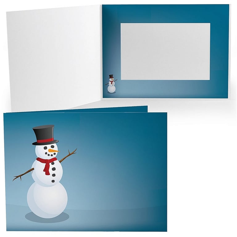 Main view Sizing Back Product Details Collectors Gallery JOYFUL SNOWMAN Holiday Photo Folder for 5x7 (landscape) prints — Use for breakfast with santa or mall santa photos, school events, holiday promotions and other special events. SNOW MAN photo folders are the perfect accompaniment to event photography with a holiday theme. Personalization allows you to add your business or event name, logo, date and more. Often called cardboard photo folders, our photo event folders are made from a smooth lightweight cardstock paper. Features & Information Price INCLUDES Personalizing Overall size measures 8 1/8" x 6" (when closed) Picture opening measures 6½" x 4½" (for 7" x 5" photos) Inside border images shown are for 4" x 6" folders, 5" x 7" inside window border is slightly narrower Lightweight smooth finish paper Printed design on front cover, back cover and inside window border Holds one photo on the inside Window border glued along top edge, bottom edge open Shipped flat, not folded Envelopes available separately Individually priced; sold in 50's. Made in the U.S.A. JOYFUL SNOWMAN Holiday Photo Folder for 5x7 (landscape) prints Model #021352532179 $1.75 This item can be expected to ship by 01/26/2026. Order now by clicking ADD TO CART (below); you are only charged when we actually ship. Or, Click here to be automatically notified when it comes back in stock. Your Price Match is Active Your request for a price of $0.00 for a minimum quantity of has been accepted. You have [time] left to purchase this item for $0.00 instead of $1.75 each. Find a Lower Price? We BEAT All Authorized Retailers [?] FEATURESDisplays:5"x7"Material:Card-stockFinish:Blue, Multi-ColorOccasion:Group Events + Parties, ChristmasStyle:Contemporary, Words & whimsy, Minimal, TraditionalOrientation:Horizontal OnlyDisplay Type:not applicable n/a SHARE THIS ITEM Share on Facebook
