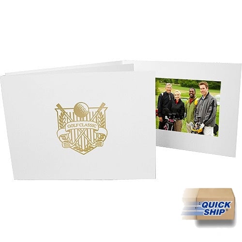 Our photo folder in white, accented with a golf inspired crest in gold foil. The design is hot stamped (imprinted) onto the front of the folder.