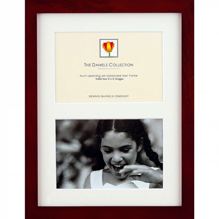 Main view Product Details Dennis Daniels® Dark walnut bevelled collage with coordinated mat by Dennis Daniels® — This classic dark walnut frame, with removable mat, displays two (2) 4"x6" photos with the mat or one 10½"x8" photo without the mat.Frame comes complete with both a hardboard dual easel back for landscape and portrait use as well as recessed mounts for easy wall hanging.The acid-free soft white mat is nicely coordinated for a clean look. Glare resistant glass lens. Moulding edge is 5/8" wide.Crafted by the Dennis Daniels Company of California - fine wood frames for generations. Dark walnut bevelled collage with coordinated mat by Dennis Daniels® Dennis Daniels® HOLIDAY CELEBRATION Savings - ends Sunday: Buy More / Save More * Add this item to your cart for the full details of this promotion. Conditions may apply. Model #782680009442 $19.50 only 2 left, order soon. In stock Ships next business day [?] Your Price Match is Active Your request for a price of $0.00 for a minimum quantity of has been accepted. You have [time] left to purchase this item for $0.00 instead of $19.50 each. Find a Lower Price? We BEAT All Authorized Retailers [?] FEATURESDisplays:4"x6"Material:Wood (full grain)Finish:BrownOccasion:Business & office, Home decorating, Team & coach gifts, Thank-Motivate-Reward, Celebrating Travels, Corporate giftsStyle:Classic, Minimal, Traditional, ContemporaryOrientation:BothBrand:Dennis Daniels® Approx. Overall Dimensions:11 3/4"x9" This item ships in its own box SHARE THIS ITEM Share on Facebook