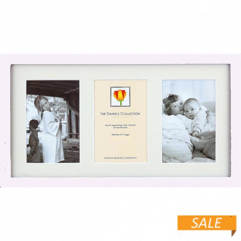 Main view Product Details Dennis Daniels® GALLERY WOODS triple 5x7 white collage w/soft-white mat by Dennis Daniels® — The Dennis Daniels classic white wood frame with removable mat holds three 5"x7" photos or one 9"x18" print or mat. We think you will love the richness of the color and grain, always a favorite.Piece comes complete with recessed black anodized wall hook stations incorporated in the back for easy wall mounting.The acid-free mat will provide years of security for your prints. Glare resistance picture frame glass lens. Moulding edge is ¾".Many other sizes and configurations are available from our workshop. See Related Items on the lower right portion of this page for other wood stains and sizes. 04/13PotteryBarn: $45.00 GALLERY WOODS triple 5x7 white collage w/soft-white mat by Dennis Daniels® Model #80021048 List $38.50 You pay $19.90 In stock Can be shipped today [?] Your Price Match is Active Your request for a price of $0.00 for a minimum quantity of has been accepted. You have [time] left to purchase this item for $0.00 instead of $19.90 each. Find a Lower Price? We BEAT All Authorized Retailers [?] FEATURESDisplays:5"x7"Material:Wood (full grain)Finish:WhiteOccasion:Birthday, Business & office, Congratulations, Home decorating, Housewarming, Celebrating Travels, Corporate giftsStyle:Classic, Contemporary, Minimal, Sports & leisure, TraditionalOrientation:BothBrand:Dennis Daniels®Display Type:Desktop or Wall Approx. Overall Dimensions:19 1/2"x10" This item ships in its own box SHARE THIS ITEM Share on Facebook