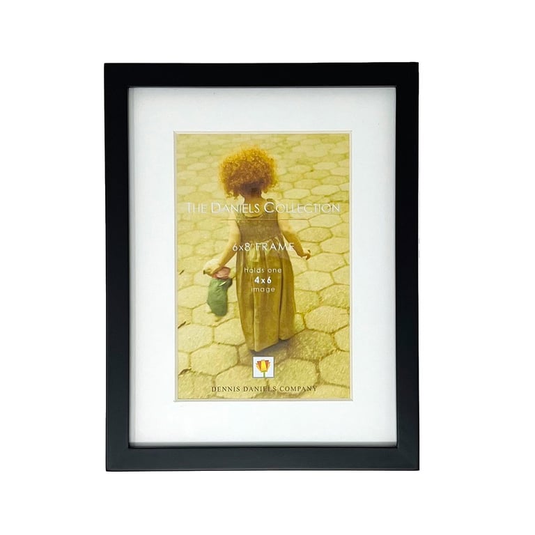 Main view Product Details Dennis Daniels® GALLERY COLLECTION Black w/White mat 6x8/4x6 by Dennis Daniels® — Handsome, solid wood ebony-black frame with glare resistant glazing is elegant and easy to live with. Perfect for the decorator.Constructed of hardwood with tailed corners and exact fitting back. Holds a 4"x6" print or art piece with its mat; 6"x8" without the mat. Acid-free mat is professionally bevel cut.Glare resistant glass lens. Dual easel back for landscape or portrait tabletop display. Recessed wall mounts included for easy hanging. Moulding edge is ½" wide.Quality crafted by Dennis Daniels® of California.This is a classic style at a great price. GALLERY COLLECTION Black w/White mat 6x8/4x6 by Dennis Daniels® Model #782680013265 List $19.50 You pay $15.95 This item is currently out of stock and we do not have an expected date at the present time. click here to be automatically notified when it comes back in stock or email merchandising@sendaframe.com for availability information. You can place this item in your shopping cart. It will be added to the 'saved for later' section. Your Price Match is Active Your request for a price of $0.00 for a minimum quantity of has been accepted. You have [time] left to purchase this item for $0.00 instead of $15.95 each. Find a Lower Price? We BEAT All Authorized Retailers [?] FEATURESDisplays:4"x6"Material:Wood (full grain)Finish:BlackOccasion:Business & office, Corporate gifts, Friendship, Good luck, Home decorating, Housewarming, Public Area Display, Thank-Motivate-RewardStyle:Classic, Contemporary, TraditionalOrientation:BothBrand:Dennis Daniels®Display Type:Desktop or Wall This item ships in its own box SHARE THIS ITEM Share on Facebook