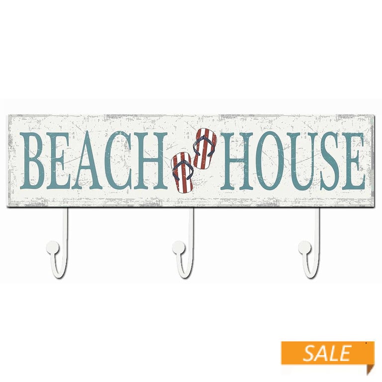 Product Details SIXTREES® BEACH HOUSE Wood 16x5 Box Sign/Hanger — BEACH HOUSE This box sign with flip-flop accent will certainly be a conversation starter. Useful too with its 3 strong hooks for hanging towels and wet suits. Sixtrees®. BEACH HOUSE Wood 16x5 Box Sign/Hanger Model #29220996 List $16.00 You pay $8.90 In stock Ships next business day [?] Your Price Match is Active Your request for a price of $0.00 for a minimum quantity of has been accepted. You have [time] left to purchase this item for $0.00 instead of $8.90 each. Find a Lower Price? We BEAT All Authorized Retailers [?] FEATURESMaterial:Wood (full grain)Finish:Blue(Light), WhiteOccasion:Friendship, Weekend Host Gifts, Housewarming, Public Area DisplayStyle:Contemporary, Pop Culture, Rustic/Lodge, Shabby Chic, Sports & leisure, Words & whimsy, Coastal, Nautical & Shore, Expressions > ready madeBrand:SIXTREES®Display Type:Wall Only Approx. Overall Dimensions:16"x5"x1 1/2" This item ships in its own box SHARE THIS ITEM Share on Facebook