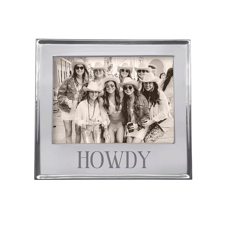 Main view Product Details Mariposa® HOWDY 7x5 SIGNATURE frame by Mariposa® — HOWDY Mariposa's stylishly engraved HOWDY frame makes an excellent gift with a wild west theme. People love the Mariposa casual, sculpted elegance paired with their strong, virtually carefree material. Their artisan handcrafted look in recycled aluminum is both pleasing to the eye and touch, as well as 100% ecologically sound. Shop the entire collection: Mariposa® Design Collection Important Note: Mariposa items are hand engraved. Your piece may differ slightly from the photo. HOWDY 7x5 SIGNATURE frame by Mariposa® Mariposa® WINTER CELEBRATION Savings - Buy More / Save More * Add this item to your cart for the full details of this promotion. Conditions may apply. Model #808813197975 $75.00 only 3 left, order soon. In stock Ships next business day [?] Your Price Match is Active Your request for a price of $0.00 for a minimum quantity of has been accepted. You have [time] left to purchase this item for $0.00 instead of $75.00 each. Find a Lower Price? We BEAT All Authorized Retailers [?] FEATURESDisplays:5"x7"Material:AluminumFinish:SilverOccasion:Friendship, Good luck, Housewarming, Team & coach gifts, Weekend Host GiftsStyle:Contemporary, Eco-Friendly-Recycled, Modern, Santa Fe, Shabby Chic, Sophisticated, Words & whimsy, Sentiments | ready madeOrientation:Horizontal OnlyBrand:Mariposa®Display Type:Desktop Only Approx. Overall Dimensions:7 3/4"x9 3/4"x1" This item ships in its own box SHARE THIS ITEM Share on Facebook