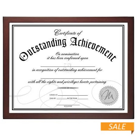 Product Details Malden Designs® Walnut-brown wood certificate 8½x11 frame — This is a contemporary piece crafted in walnut-brown stained wood.Square edged corners, narrow stylish moulding, and fine grain detail, it has a quality look and feel at a value price.Displays an 8½"x11" document, diploma or certificate print. Has an easel back for tabletop display. Wall mounting attachments also included for easy hanging.Moulding measures 5/8" wide. Glare resistant glass lens.Produced by Malden Designs®. Walnut-brown wood certificate 8½x11 frame Model #096287124133 List $18.00 You pay $10.90 In stock Ships next business day [?] Your Price Match is Active Your request for a price of $0.00 for a minimum quantity of has been accepted. You have [time] left to purchase this item for $0.00 instead of $10.90 each. Find a Lower Price? We BEAT All Authorized Retailers [?] FEATURESDisplays:8.50"x11"Material:Wood (mdf/engineered)Finish:BrownOccasion:Business & officeStyle:Classic, Contemporary, TraditionalOrientation:BothBrand:Malden Designs®Display Type:Desktop or Wall Approx. Overall Dimensions:12 1/4"x9 1/2"x1" This item ships in its own box SHARE THIS ITEM Share on Facebook