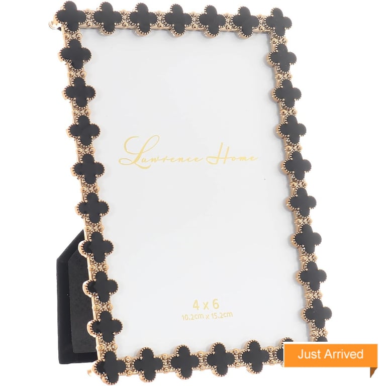 Main view Product Details Lawrence Frames® CLOVER BLACK ENAMEL+GOLD 4x6 frame — BLACK enamel well crafted contemporary design frame. Gold trim accent. Cast gold metal design with whie enamel clover motif High quality easy open black backing can stand vertically or horizontally Comes with easel backing for table top display, and pre-installed hangers for wall mounting Heavy weight construction with luxurious finish By Lawrence®. CLOVER BLACK ENAMEL+GOLD 4x6 frame Model #48090506 List $32.00 You pay $20.95 This item IS in stock and can be expected to ship 11/19/2025 Your Price Match is Active Your request for a price of $0.00 for a minimum quantity of has been accepted. You have [time] left to purchase this item for $0.00 instead of $20.95 each. Find a Lower Price? We BEAT All Authorized Retailers [?] FEATURESDisplays:4"x6"Material:EnamelFinish:Black, GoldOccasion:Anniversary, Birthday, Business & office, Congratulations, Corporate gifts, Friendship, Good luck, Home decorating, Housewarming, Mother`s Day, Retirement, Romantic, Sympathy, Thank-Motivate-Reward, Wedding, Weekend Host GiftsStyle:Contemporary, RomanticOrientation:BothBrand:Lawrence Frames®Display Type:Desktop or Wall Approx. Overall Dimensions:4 11/16"x6 11/16"x3/4" This item ships in its own box SHARE THIS ITEM Share on Facebook