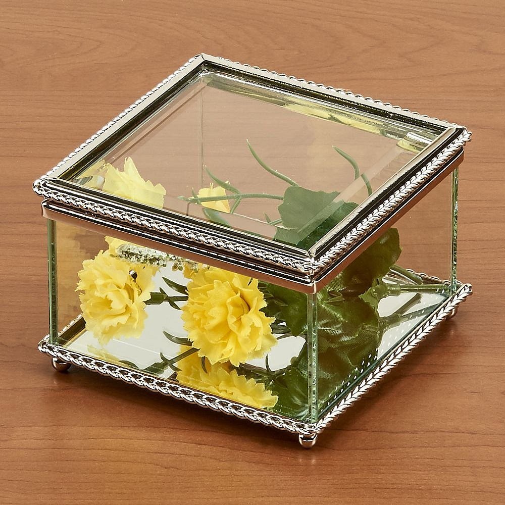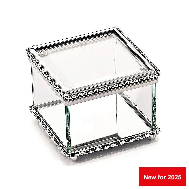 This beautiful 3¼" x 3¼" x 2½" H square box is glass and has a hinged cover. The top and bottom edges are trimmed with a non tarnish braided border. The inside bottom is a mirror and the bottom of the box has four ball feet. White gift box.