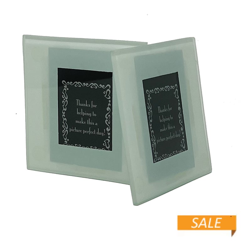 Main view Product Details Fashioncraft-Excello MINI GLASS PHOTO COASTERS (packed in set of 2) — These trendy glass photo coasters offer a unique, and functional, way to display photos while also saving the furniture from the dreaded ring! Packaged in sets of two, each is a 3½" square with a 1¾" x 2" photo opening filled with a preprinted note that says, "Thanks for helping to make this a picture perfect day!" Great for photos of your event or any of your guests' favorite shots, each set of two glass photo coasters comes packed in a clear box tied with an white organza ribbon. MINI GLASS PHOTO COASTERS (packed in set of 2) Model #638054039525 List $8.50 You pay $4.95 In stock Your Price Match is Active Your request for a price of $0.00 for a minimum quantity of has been accepted. You have [time] left to purchase this item for $0.00 instead of $4.95 each. Find a Lower Price? We BEAT All Authorized Retailers [?] FEATURESDisplays:1.75"x2"Material:GlassFinish:ClearOccasion:Business & office, Congratulations, Corporate gifts, Group Events + Parties, Housewarming, Thank-Motivate-Reward, Celebrating TravelsStyle:Contemporary, Hi-tech, Words & whimsyBrand:Fashioncraft-ExcelloDisplay Type:not applicable n/a Approx. Overall Dimensions:3 1/2"x3 1/2" This item ships in its own box SHARE THIS ITEM Share on Facebook