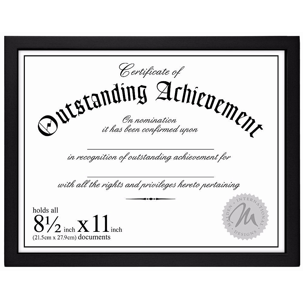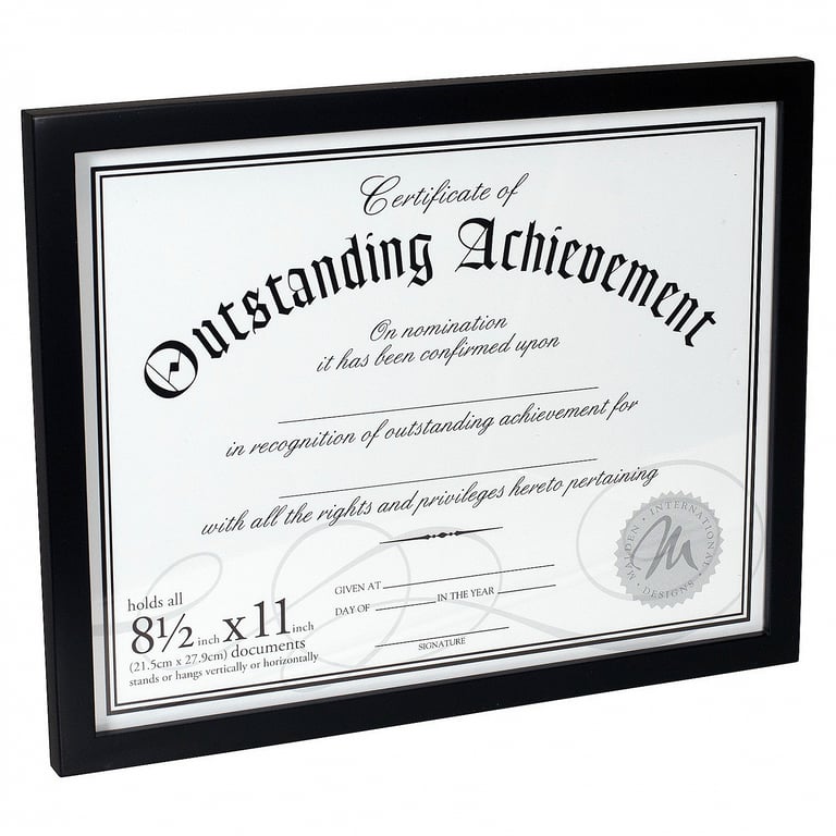 Main view Product Details Malden Designs® Ebony black wood 8½x11 certificate — This is a contemporary piece crafted in ebony/black MDF engrineered wood.Square edged corners, narrow stylish moulding, and fine grain detail, it has a quality look and feel at a value price.Displays an 8½"x11" document, diploma or certificate print. Has an easel back for tabletop display. Wall mounting attachments also included for easy hanging.Moulding measures 5/8" wide. Glare resistant glass lens.By Malden Designs®. Ebony black wood 8½x11 certificate Malden Designs® FALL CELEBRATION Savings - ends SundayBuy More / Save More * Add this item to your cart for the full details of this promotion. Conditions may apply. Model #87641685 List $17.50 You pay $13.95 In stock Ships next business day [?] Your Price Match is Active Your request for a price of $0.00 for a minimum quantity of has been accepted. You have [time] left to purchase this item for $0.00 instead of $13.95 each. Find a Lower Price? We BEAT All Authorized Retailers [?] FEATURESDisplays:8.50"x11"Material:Wood (mdf/engineered)Finish:BlackOccasion:Business & officeStyle:Classic, Contemporary, TraditionalOrientation:BothBrand:Malden Designs®Display Type:Desktop or Wall This item ships in its own box SHARE THIS ITEM Share on Facebook
