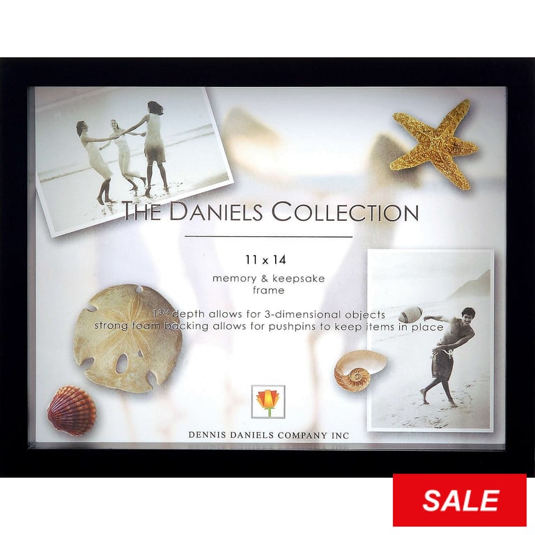 Main view Product Details Dennis Daniels® Ebony-Black 1¾in depth craft Keepsake 11x14 Box by Dennis Daniels® — This is a beautiful shadowbox for memorabilia, miniature crafts, dried flowers - - - or your fine photo in a dramatic display. Great for displaying children's 'objets d'art'.Extra 1¾" depth for your 3 dimensional objects. A strong foam backing allows use of pushpins to keep objects in-place. Border width measures a little more then ½".Crafted of very nice solid woods; hand finished with a deep stain coordinated with the grain. Glare resistant glass lens. Rests easily on any flat surface - or use the built-in hanging hooks to display on a wallBench-made by Dennis Daniels® of California. the beautiful frame people. Ebony-Black 1¾in depth craft Keepsake 11x14 Box by Dennis Daniels® Model #782680015528 List $70.00 You pay $49.95 In stock Can be shipped today [?] Your Price Match is Active Your request for a price of $0.00 for a minimum quantity of has been accepted. You have [time] left to purchase this item for $0.00 instead of $49.95 each. Find a Lower Price? We BEAT All Authorized Retailers [?] FEATURESDisplays:11"x14"Material:Wood (full grain)Finish:BlackOccasion:Birthday, Craft Projects, Friendship, Graduation, Inspirational, Military Honors, Romantic, Team & coach gifts, Thank-Motivate-Reward, Home decorating, Corporate giftsStyle:Classic, Traditional, RomanticOrientation:BothBrand:Dennis Daniels®Display Type:Desktop or Wall Approx. Overall Dimensions:14 3/4"x11 3/4"x2 1/2" This item ships in its own box SHARE THIS ITEM Share on Facebook
