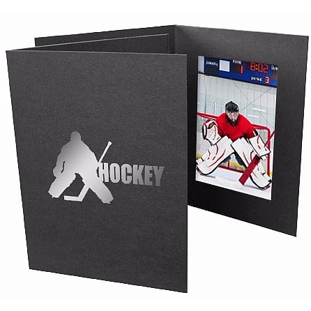 Our photo folder in black, accented with a hockey player in silver foil. The design is hot stamped (imprinted) onto the front of the folder.
