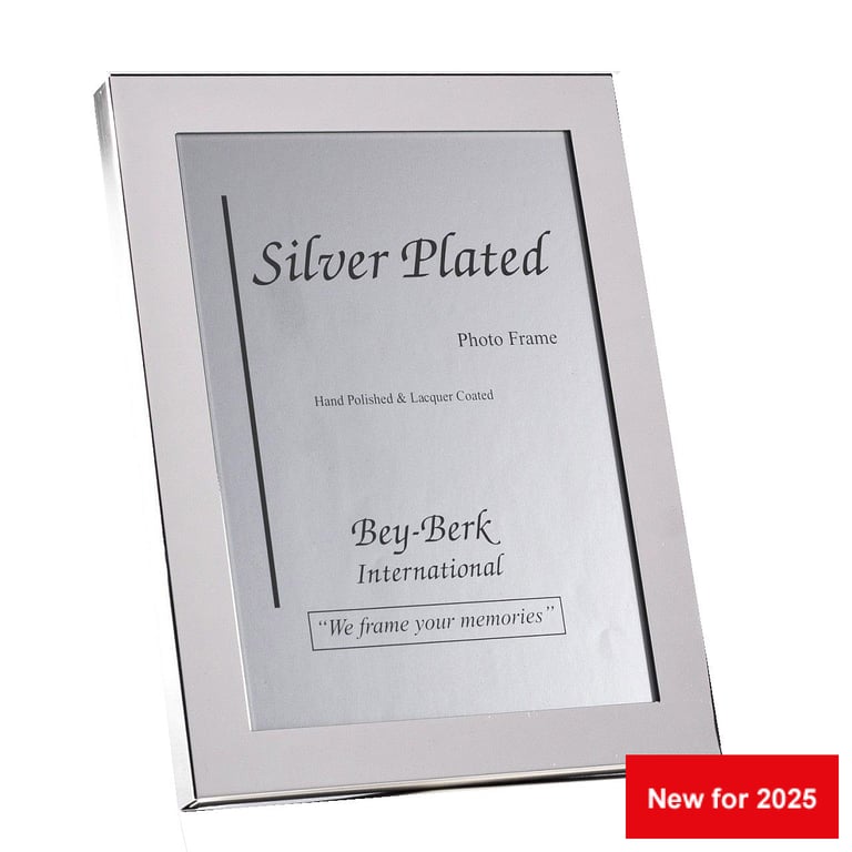 Main view Product Details Bey-Berk Engraveable Mirror-finished 1-in silverplate 8x10 frame — Wide 1'' border silverplate frame, polished to a high-polished finish. Extremely high quality, very comparable to more expensive silverplate frames from Italy. Slide-in channel black felt back with dual easel for portrait or landscape desktop display. Features an elegant stay ribbon for limiting the easel's angle. Wall-mounts also included for easy hanging. Glare resistant glass lens. Ships in a protective gift box.Engraving available Click Personalize this item for more information.Crafted by Bey-Berk®. Engraveable Mirror-finished 1-in silverplate 8x10 frame BEY-BERK® WINTER CELEBRATION SAVINGS - Buy More / Save More * Add this item to your cart for the full details of this promotion. Conditions may apply. Model #797140220060 List $60.00 You pay $48.95 In stock Ships next business day [?] Your Price Match is Active Your request for a price of $0.00 for a minimum quantity of has been accepted. You have [time] left to purchase this item for $0.00 instead of $48.95 each. Find a Lower Price? We BEAT All Authorized Retailers [?] FEATURESDisplays:8"x10"Material:SilverplateFinish:SilverOccasion:Congratulations, Get well, Graduation, Mother`s Day, Housewarming, Inspirational, Thank-Motivate-Reward, Birthday, Corporate giftsStyle:Classic, Minimal, TraditionalOrientation:BothBrand:Bey-BerkDisplay Type:Desktop or Wall Approx. Overall Dimensions:9"x10 3/4"x3/4" This item ships in its own box SHARE THIS ITEM Share on Facebook