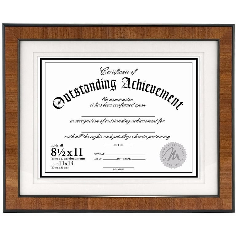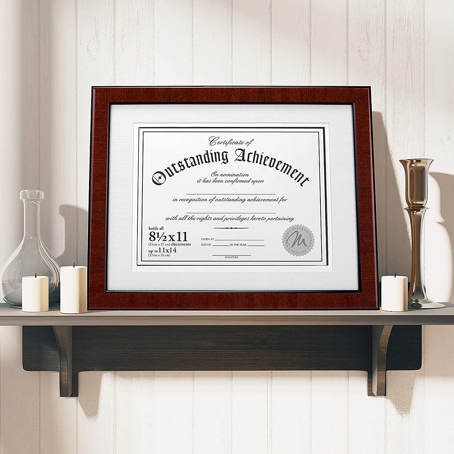 Main view Product Details Malden Designs® BURLWOOD Document frame w/fancy double mat 11x14/11x8½ — Striking two-tone hardwood frame has the look of a gallery quality piece. Rich BURLWOOD and black trim makes your document or certificate stand out.Made of nicely grained faux-hardwood, the piece is beautifully detailed in a reproduction fashion. Elegant double mat enhances your certificates look. Displays an 11"x8½" print or document with its mat; an 11"x14" without mat.Wall mounts included for easy hanging. Glare resistant glass lens.Quality crafted by Malden®. To shop the collection, click Malden Design® BURLWOOD Document frame w/fancy double mat 11x14/11x8½ Model #096287985208 List $23.00 You pay $16.95 In stock Ships next business day [?] Your Price Match is Active Your request for a price of $0.00 for a minimum quantity of has been accepted. You have [time] left to purchase this item for $0.00 instead of $16.95 each. Find a Lower Price? We BEAT All Authorized Retailers [?] FEATURESDisplays:8.50"x11"Material:Wood (mdf/engineered)Finish:BrownOccasion:Business & office, Corporate gifts, Graduation, Home decoratingStyle:Biedermeier, Classic, Sophisticated, TraditionalOrientation:BothBrand:Malden Designs®Display Type:Wall Only Approx. Overall Dimensions:16"x13" This item ships in its own box SHARE THIS ITEM Share on Facebook