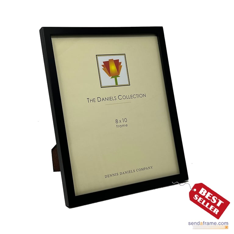 Main view Product Details Dennis Daniels® Black GALLERY WOODS '41 series' 8x10 frame by Dennis Daniels® — The original solid poplar classic from Daniels is elegant and an easy style to decorate with.Often used for gallery presentations, this series is constructed of matched varnished grained hardwoods with tailed corners.Dual easel for landscape or portrait tabletop use; recessed wall mounting hooks included for easy hanging. Glare resistant glass lens. Moulding edge is ½" wide.Quality crafted by Dennis Daniels®, the beautiful frame people of California. Black GALLERY WOODS '41 series' 8x10 frame by Dennis Daniels® Model #782680005222 List $22.50 You pay $17.95 In stock Ships next business day [?] Your Price Match is Active Your request for a price of $0.00 for a minimum quantity of has been accepted. You have [time] left to purchase this item for $0.00 instead of $17.95 each. Find a Lower Price? We BEAT All Authorized Retailers [?] FEATURESDisplays:8"x10"Material:Wood (full grain)Finish:BlackOccasion:Bar & Bat Mitzvah, Business & office, Corporate gifts, Home decorating, Military Honors, Team & coach gifts, Celebrating TravelsStyle:Classic, Architectural, Minimal, Contemporary, TraditionalOrientation:BothBrand:Dennis Daniels®Display Type:Desktop or Wall Approx. Overall Dimensions:8 3/8"x10 3/8" This item ships in its own box SHARE THIS ITEM Share on Facebook