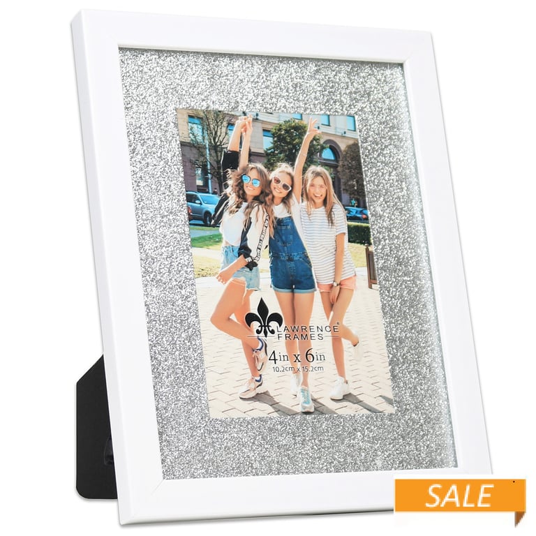 Back to results Scroll Items 9959 of 11145 Main view Product Details Lawrence Frames® Satin-White matted 6x8/4x6 frame with Silver Glitter Mat — Glitzy and bright silver glitter mat with satin white finish frame. Easy open bendable clip black backing makes it simple to open and insert your photo. Includes hangers for wall mounting and easel backing for tabletop display. This beautiful frame comes with glass to protect your photo, and is individually boxed.This style displays a 4"x6" print or art piece with its professionally cut 45° bevel mat; 6"x8" overall without the mat. Mat and dual easel backing are produced with acid free stock to insure a lifetime of enjoyment and protection. Crafted by Lawrence Frames®. Satin-White matted 6x8/4x6 frame with Silver Glitter Mat Lawrence® BLACK FRIDAY CELEBRATION Savings: Buy More / Save More * Add this item to your cart for the full details of this promotion. Conditions may apply. Model #751148081634 List $16.50 You pay $9.90 In stock Ships next business day [?] Your Price Match is Active Your request for a price of $0.00 for a minimum quantity of has been accepted. You have [time] left to purchase this item for $0.00 instead of $9.90 each. Find a Lower Price? We BEAT All Authorized Retailers [?] Approx. Overall Dimensions:6 13/16"x8 13/16"x11/16" This item ships in its own box SHARE THIS ITEM Share on Facebook