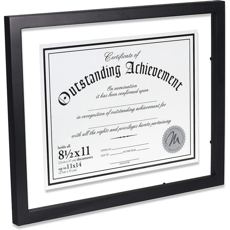 Main view Product Details Malden Designs® Stylish black float certificate 11x14/8.5x11 frame — Show off you diploma or certificate in this ebony black furniture finished wood float frame.Double glass lenses sandwich your print or photo and show the wall behind the print (so the paper appears to "float").The full interior size of the piece is 11"x14" - so it can display up to a 10"x13" as a float.Wall mount is permanently attached to the wood moulding, out of sight.Quality crafted by Malden®. To shop the collection, click Malden Design® Stylish black float certificate 11x14/8.5x11 frame Malden Designs® FALL CELEBRATION Savings - ends SundayBuy More / Save More * Add this item to your cart for the full details of this promotion. Conditions may apply. Model #87205184 List $26.00 You pay $16.95 In stock Ships next business day [?] Your Price Match is Active Your request for a price of $0.00 for a minimum quantity of has been accepted. You have [time] left to purchase this item for $0.00 instead of $16.95 each. Find a Lower Price? We BEAT All Authorized Retailers [?] FEATURESDisplays:11"x14"Material:Wood (mdf/engineered)Finish:BlackOccasion:Business & office, Home decorating, Team & coach giftsStyle:Architectural, Contemporary, Double-sided, Hi-tech, Float FramesOrientation:BothBrand:Malden Designs®Display Type:Wall Only Approx. Overall Dimensions:12"x15"x3/4" This item ships in its own box SHARE THIS ITEM Share on Facebook