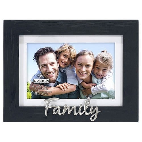 Main view Product Details Malden Designs® FAMILY ebony-black matted 5x7/4x6 keepsake frame — For your special FAMILY, a frame all your own. Add a great photo and you have a gift that will make any father beam with joy anytime she sees it ! Displays a 6"x4" print with its mat; a 7"x5" print without mat.Fashioned in distressed black wood stain finish with pewter applique words. Glare resistant glass lens.By Malden Design®. FAMILY ebony-black matted 5x7/4x6 keepsake frame Malden Designs® FALL CELEBRATION Savings - ends SundayBuy More / Save More * Add this item to your cart for the full details of this promotion. Conditions may apply. Model #87148597 List $18.50 You pay $13.95 In stock Ships next business day [?] Your Price Match is Active Your request for a price of $0.00 for a minimum quantity of has been accepted. You have [time] left to purchase this item for $0.00 instead of $13.95 each. Find a Lower Price? We BEAT All Authorized Retailers [?] FEATURESDisplays:4"x6"Material:Wood (mdf/engineered)Finish:Black, SilverOccasion:Hanukkah, Christmas, Father`s Day, Housewarming, Mother`s DayStyle:Distressed - Weathered, Sports & leisure, Words & whimsyOrientation:Horizontal OnlyBrand:Malden Designs®Display Type:Desktop or Wall Approx. Overall Dimensions:8"x5 3/4"x1" This item ships in its own box SHARE THIS ITEM Share on Facebook
