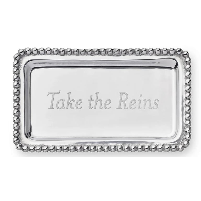 Main view Product Details Mariposa® TAKE THE REINS 7in Statement Tray crafted by Mariposa® — TAKE THE REINS Let the inspirational message of this tray motivate you daily, or encourage a friend or loved one. Perfectly sized to fit a check, making this a great way to jazz up a monetary gift. The STATEMENT TRAY was designed by Michael Updike and hand-crafted by Mariposa. SendAFrame stocks the entire Mariposa® picture frame line - and related Brand and Design styled items like this special tray. Shop the entire collection: Mariposa® Design Collection Important Note: Mariposa items are hand engraved. Your piece may differ slightly from the photo. TAKE THE REINS 7in Statement Tray crafted by Mariposa® Mariposa® WINTER CELEBRATION Savings - Buy More / Save More * Add this item to your cart for the full details of this promotion. Conditions may apply. Model #808813198064 List $42.00 You pay $38.95 In stock Can be shipped today [?] Your Price Match is Active Your request for a price of $0.00 for a minimum quantity of has been accepted. You have [time] left to purchase this item for $0.00 instead of $38.95 each. Find a Lower Price? We BEAT All Authorized Retailers [?] FEATURESMaterial:AluminumFinish:SilverOccasion:Back to School, Birthday, Congratulations, Corporate gifts, Group Events + Parties, Friendship, Good luck, Graduation, Housewarming, Inspirational, Retirement, Thank-Motivate-RewardStyle:Contemporary, Santa Fe, Shabby Chic, Sports & leisure, Words & whimsy, Eco-Friendly-Recycled, Modern, Sentiments | ready madeBrand:Mariposa®Display Type:not applicable n/a Approx. Overall Dimensions:6 3/4"x3 3/4"x1/2" This item ships in its own box SHARE THIS ITEM Share on Facebook