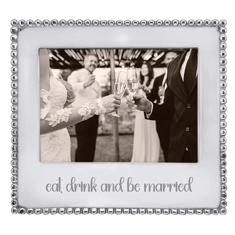 Main view Product Details Mariposa® EAT - DRINK - BE MARRIED Statement 5x7 frame crafted by Mariposa® — A toast to love, laughter, and forever. The Eat, Drink & Be Married Beaded 5x7 frame captures the joy of celebrating life’s sweetest moments. Thoughtfully crafted to highlight a favorite engagement or wedding photo, this frame makes a meaningful gift for newlyweds, couples-to-be, or hosts of a perfectly planned celebration. Shop the entire collection: Mariposa® Design Collection. Always shipped in a Mariposa beautiful signature box - makes gifting easy! Important Note: Mariposa items are hand engraved. Your piece may differ slightly from the photo. EAT - DRINK - BE MARRIED Statement 5x7 frame crafted by Mariposa® Model #808813164939 $80.00 only 4 left, order soon. In stock Can be shipped today [?] Your Price Match is Active Your request for a price of $0.00 for a minimum quantity of has been accepted. You have [time] left to purchase this item for $0.00 instead of $80.00 each. Find a Lower Price? We BEAT All Authorized Retailers [?] FEATURESDisplays:5"x7"Material:AluminumFinish:SilverOccasion:Anniversary, Engagement, Romantic, WeddingStyle:Contemporary, Eco-Friendly-Recycled, Romantic, Santa Fe, Words & whimsy, Sentiments | ready made, GlamOrientation:Horizontal OnlyBrand:Mariposa®Display Type:Desktop Only Approx. Overall Dimensions:8 3/4"x7 3/4" This item ships in its own box SHARE THIS ITEM Share on Facebook
