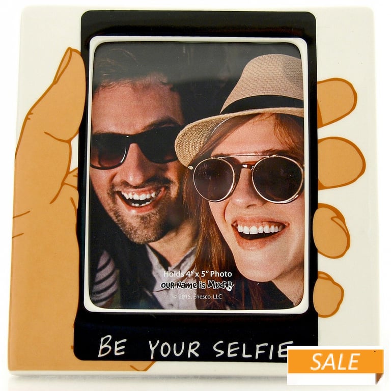 Main view Reverse Product Details Enesco BE YOUR SELFIE<br>by Our Name Is Mud® — BE YOUR SELFIE A GREAT gift to thank friends and family for your get together.Holds a 4" x 5" photo. Glare resistant glass lens. Easel back for horizontal tabletop display. Gift Boxed. Designed by Lorrie Veasey. Another adorable frame by Our Name is Mud®. BE YOUR SELFIE by Our Name Is Mud® Model #045544814546 List $12.95 You pay $4.90 In stock Can be shipped today [?] Your Price Match is Active Your request for a price of $0.00 for a minimum quantity of has been accepted. You have [time] left to purchase this item for $0.00 instead of $4.90 each. Find a Lower Price? We BEAT All Authorized Retailers [?] FEATURESDisplays:4"x5"Material:CeramicFinish:Black, Natural, WhiteOccasion:Birthday, Group Events + Parties, Friendship, Sweet 16, Thank-Motivate-Reward, WeddingStyle:Contemporary, Words & whimsy, Sentiments | ready madeOrientation:Vertical OnlyDisplay Type:Desktop Only Approx. Overall Dimensions:6"x6"x3/8" This item ships in its own box SHARE THIS ITEM Share on Facebook