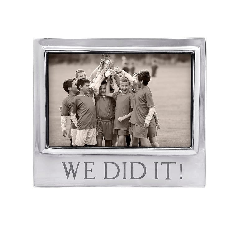 Main view Product Details Mariposa® WE DID IT! 6x4 SIGNATURE frame by Mariposa® — The SIGNATURE frame for 6"x4" photos engraved with the sentiment WE DID IT! Handcrafted from 100% recycled, buffed-until-brilliant aluminum Items will not tarnish If needed, handwash in warm water with mild soap and towel dry immediately Occasional use of non-abrasive metal polish will revive luster Important Note: Mariposa items are hand engraved. Your piece may differ slightly from the photo. Hint: If you would like this style customized with names, a date . . . use the blank model and have us engrave for you. WE DID IT! 6x4 SIGNATURE frame by Mariposa® Mariposa® HOLIDAY CELEBRATION Savings - Buy More / Save More * Add this item to your cart for the full details of this promotion. Conditions may apply. Model #808813185293 List $64.00 You pay $58.95 In stock Ships next business day [?] Your Price Match is Active Your request for a price of $0.00 for a minimum quantity of has been accepted. You have [time] left to purchase this item for $0.00 instead of $58.95 each. Find a Lower Price? We BEAT All Authorized Retailers [?] FEATURESDisplays:4"x6"Material:AluminumFinish:SilverOccasion:Anniversary, Bar & Bat Mitzvah, Birthday, Congratulations, Engagement, Friendship, Good luck, Graduation, Grandparent`s Day, Inspirational, Military Honors, Retirement, Team & coach gifts, Thank-Motivate-Reward, WeddingStyle:Contemporary, Santa Fe, Shabby Chic, Sophisticated, Eco-Friendly-Recycled, Words & whimsy, Sentiments | ready madeOrientation:Horizontal OnlyBrand:Mariposa®Display Type:Desktop Only Approx. Overall Dimensions:6 3/4"x5 3/4"x1" This item ships in its own box SHARE THIS ITEM Share on Facebook
