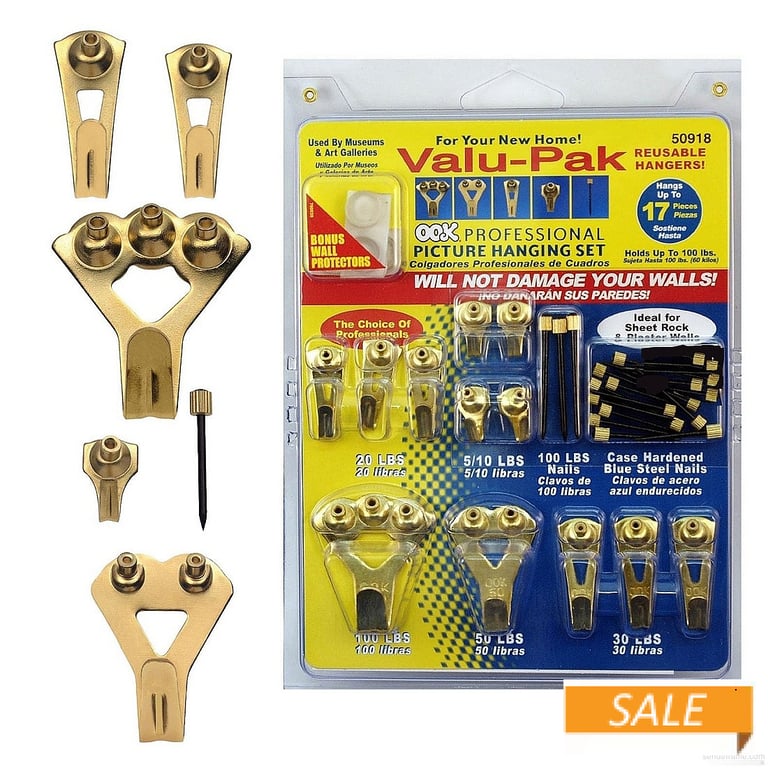 Here, a package of assorted nails, brackets, and hanger pins for professional style picture frame hanging.