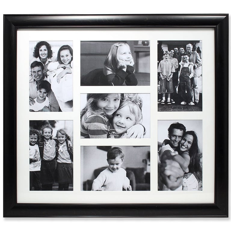 Main view Angled Reverse Product Details Lawrence Frames® Black Matted collage displays (7) 4x6 photos by Lawrence® — Ebony black wood beveled collage displays seven (7) 4"x6" prints in a very flattering design.Features bevelled style moulding. Soft white, professional cut mat. Frame includes wall mounts for easy hanging in either direction. Acid free backing for life-time care of your photo.Crafted by Lawrence®. Black Matted collage displays (7) 4x6 photos by Lawrence® Model #48068499 List $58.00 You pay $42.95 This item IS in stock and can be expected to ship 11/19/2025 Your Price Match is Active Your request for a price of $0.00 for a minimum quantity of has been accepted. You have [time] left to purchase this item for $0.00 instead of $42.95 each. Find a Lower Price? We BEAT All Authorized Retailers [?] FEATURESDisplays:4"x6"Material:Wood (full grain)Finish:BlackOccasion:Anniversary, Birthday, Friendship, Home decorating, Housewarming, Retirement, Team & coach gifts, Thank-Motivate-Reward, Celebrating TravelsStyle:Architectural, ContemporaryOrientation:BothBrand:Lawrence Frames®Display Type:Wall Only This item ships in its own box SHARE THIS ITEM Share on Facebook