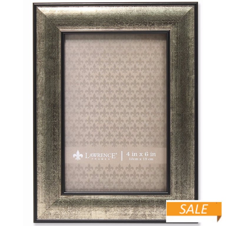 Main view Product Details Lawrence Frames® DOMED Burnished Silver/Black 4x6 frame — Burnished silver composite picture frame. Beautifully finished picture frame that will be a great decorative addition to any room. Includes a two-way easel for table top and wall hangers - for vertical or horizontal display. Black velvet backing. Picture frame comes with glass to protect your photo, and is individually boxed. Produced by Lawrence Frames®. DOMED Burnished Silver/Black 4x6 frame Model #751148068253 List $14.00 You pay $6.90 In stock Ships next business day [?] Your Price Match is Active Your request for a price of $0.00 for a minimum quantity of has been accepted. You have [time] left to purchase this item for $0.00 instead of $6.90 each. Find a Lower Price? We BEAT All Authorized Retailers [?] FEATURESDisplays:4"x6"Material:Wood (mdf/engineered)Finish:Gray/Charcoal, SilverOccasion:Home decoratingStyle:Antique, TraditionalOrientation:BothBrand:Lawrence Frames®Display Type:Desktop or Wall This item ships in its own box SHARE THIS ITEM Share on Facebook