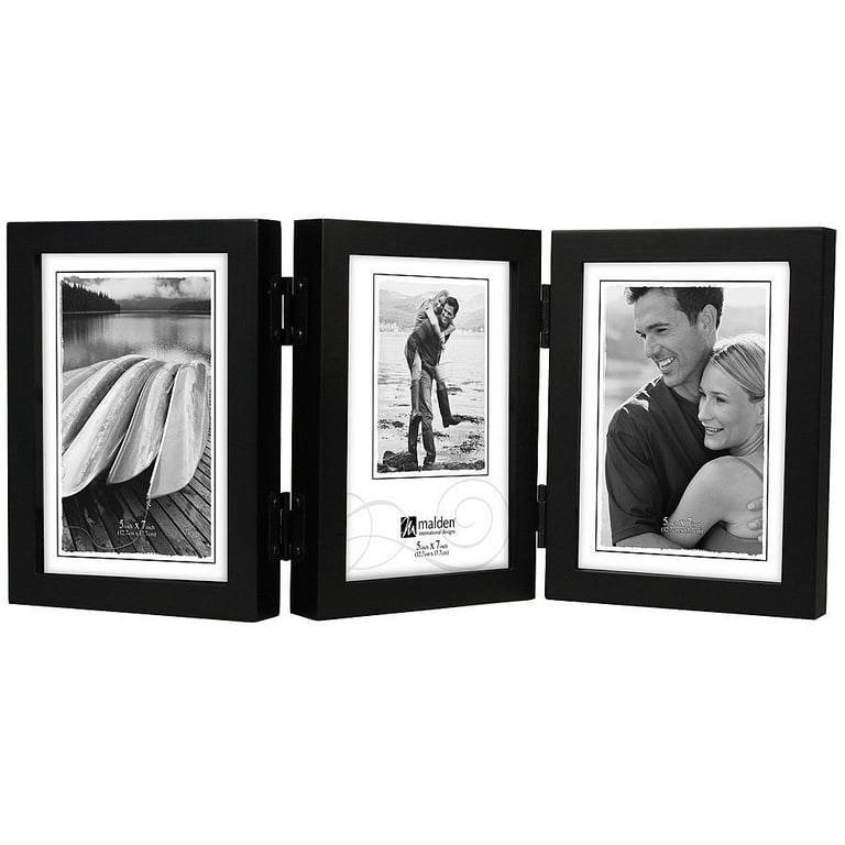 Main view Product Details Malden Designs® Triple hinged black CONCEPTS wood 5x7 frame — Quality hinged 5x7 triple "accordion" fold style frame. Displays as a 'screen' with one panel flexing back and one forward - so that this large piece will show beautifully on a tabletop. Nicely crafted in hardwoods, tailored corners and solid brass hinges. Pieces have black hardboard backs with swivel locks. Wall mounts for easy hanging are also included. Glare resistant glass lenses. Produced by Malden®. Triple hinged black CONCEPTS wood 5x7 frame Model #096287127127 List $29.00 You pay $20.95 In stock Can be shipped today [?] Your Price Match is Active Your request for a price of $0.00 for a minimum quantity of has been accepted. You have [time] left to purchase this item for $0.00 instead of $20.95 each. Find a Lower Price? We BEAT All Authorized Retailers [?] FEATURESDisplays:5"x7"Material:Wood (mdf/engineered)Finish:BlackOccasion:Business & office, Celebrating Travels, Home decoratingStyle:Classic, Contemporary, TraditionalOrientation:Vertical OnlyBrand:Malden Designs®Display Type:Desktop or Wall Approx. Overall Dimensions:17 11/16"x8"x1 1/8" This item ships in its own box SHARE THIS ITEM Share on Facebook
