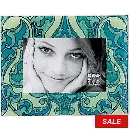 Product Details SIXTREES® KINGFISHER BLUE PAISLEY glass translucent 4x6 frame — The beveled design of this glass piece visually 'pops!'With its glare resistant picture frame glass lens, it is a gorgeous piece to have on a desk or night table.Dual easel back for portrait or landscape tabletop display.By Sixtrees®. KINGFISHER BLUE PAISLEY glass translucent 4x6 frame Model #783729161947 List $16.50 You pay $7.90 In stock Can be shipped today [?] Your Price Match is Active Your request for a price of $0.00 for a minimum quantity of has been accepted. You have [time] left to purchase this item for $0.00 instead of $7.90 each. Find a Lower Price? We BEAT All Authorized Retailers [?] FEATURESDisplays:4"x6"Material:GlassFinish:Aquamarine, BlueOccasion:Group Events + Parties, Friendship, Teacher gifts, Team & coach giftsStyle:College Dorm, Contemporary, Romantic, Pop Culture, Shabby Chic, Teens & tweensOrientation:BothBrand:SIXTREES®Display Type:Desktop Only This item ships in its own box SHARE THIS ITEM Share on Facebook