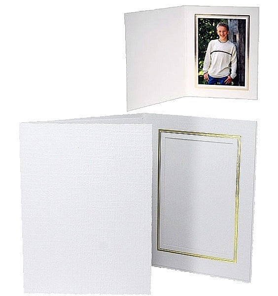 Main view Sizing Printed cover samples Product Details Collectors Gallery White Cardboard Paper Portrait Photo-mount Folder 4x5 frame w/gold foil border (sold in 25s) — Frame your photos and prints like a professional studio photographer - at a fraction of the price !Portrait Folders are suitable for a variety of photographs including Senior and School portraits, Family portraits, Engagement and Wedding portraits, Cruise and Resort photography.Terrific look and feel with white linen weave finish, deckled edges, and gold foil window border.Photo easily slides in from the side for convenient event assembly with your prints.Frame displays a 4" x 5" print or photo. NOTE: Folder style is priced individually; sold in 25s; minimum 100 pieces of this specialty item.Crafted expressly for SendAFrame. FeaturesNOTE: Folder style is priced individually; sold in 25s; minimum 100 pieces of this specialty item. White Cardboard Paper Portrait Photo-mount Folder 4x5 frame w/gold foil border (sold in 25s) Model #52455515 $19.50 ( set of 25 / $0.78 ea ) This item can be expected to ship by 11/21/2025. Order now by clicking ADD TO CART (below); you are only charged when we actually ship. Or, Click here to be automatically notified when it comes back in stock. Your Price Match is Active Your request for a price of $0.00 for a minimum quantity of has been accepted. You have [time] left to purchase this item for $0.00 instead of $0.78 each. Find a Lower Price? We BEAT All Authorized Retailers [?] FEATURESDisplays:4"x5"Material:Card-stockFinish:White, GoldOccasion:Bar & Bat Mitzvah, Business & office, Thank-Motivate-Reward, Celebrating Travels, WeddingStyle:Contemporary, Traditional, MinimalOrientation:Vertical OnlyBrand:Collectors GalleryDisplay Type:not applicable n/a SHARE THIS ITEM Share on Facebook