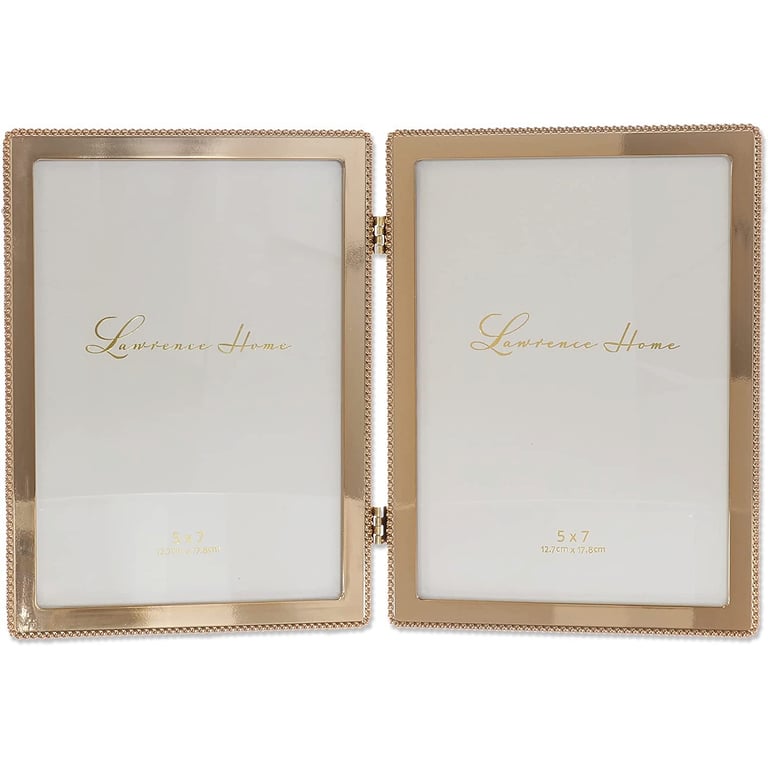 Main view Product Details Lawrence Frames® Beaded Trim Gold finish Double 5x7 frame — Gold metal picture frame with classic bead design. This heavy weight cast metal frame has a rich and lustrous gold finish. High quality black velvet backing for table-top display, and comes with hangers for wall mounting. Glare resistant glass lenses. By Lawrence®. Beaded Trim Gold finish Double 5x7 frame Model #751148085571 List $52.00 You pay $37.95 This item IS in stock and can be expected to ship 11/26/2025 Your Price Match is Active Your request for a price of $0.00 for a minimum quantity of has been accepted. You have [time] left to purchase this item for $0.00 instead of $37.95 each. Find a Lower Price? We BEAT All Authorized Retailers [?] This item ships in its own box SHARE THIS ITEM Share on Facebook