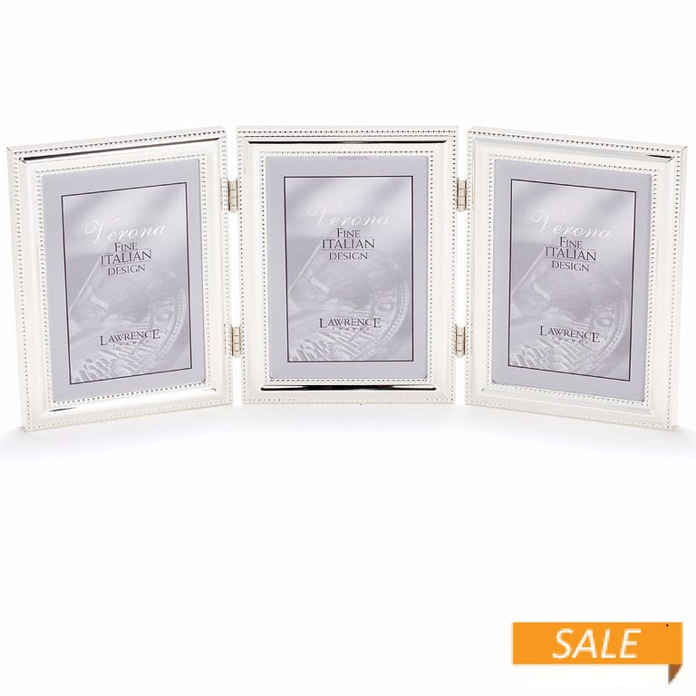 Product Details Lawrence Frames® Polished Silver Hinged 4x5 TRIPLE w/double caviar-bead trim — Our hinged silver plate frame is a beautifully crafted desk piece with invisible seams and corners.Double 'caviar bead' trim border finishes the piece with excellent detail. Attractively backed with high quality navy-blue velvet for wonderful desk appeal.Glare resistant glass lenses. Brass hinges for smooth closing.We often recommend this frame for easy gift giving since customers tell us they enjoy the quality, detail look.Produced by Lawrence®. Polished Silver Hinged 4x5 TRIPLE w/double caviar-bead trim Model #48065207 List $60.00 You pay $37.90 In stock Ships next business day [?] Your Price Match is Active Your request for a price of $0.00 for a minimum quantity of has been accepted. You have [time] left to purchase this item for $0.00 instead of $37.90 each. Find a Lower Price? We BEAT All Authorized Retailers [?] FEATURESDisplays:4"x5"Material:SilverplateFinish:SilverOccasion:Anniversary, Birthday, Good luck, Graduation, Mother`s Day, Retirement, Romantic, Thank-Motivate-Reward, Celebrating Travels, WeddingStyle:Antique, Classic, Traditional, RomanticOrientation:Vertical OnlyBrand:Lawrence Frames®Display Type:Desktop or Wall This item ships in its own box SHARE THIS ITEM Share on Facebook