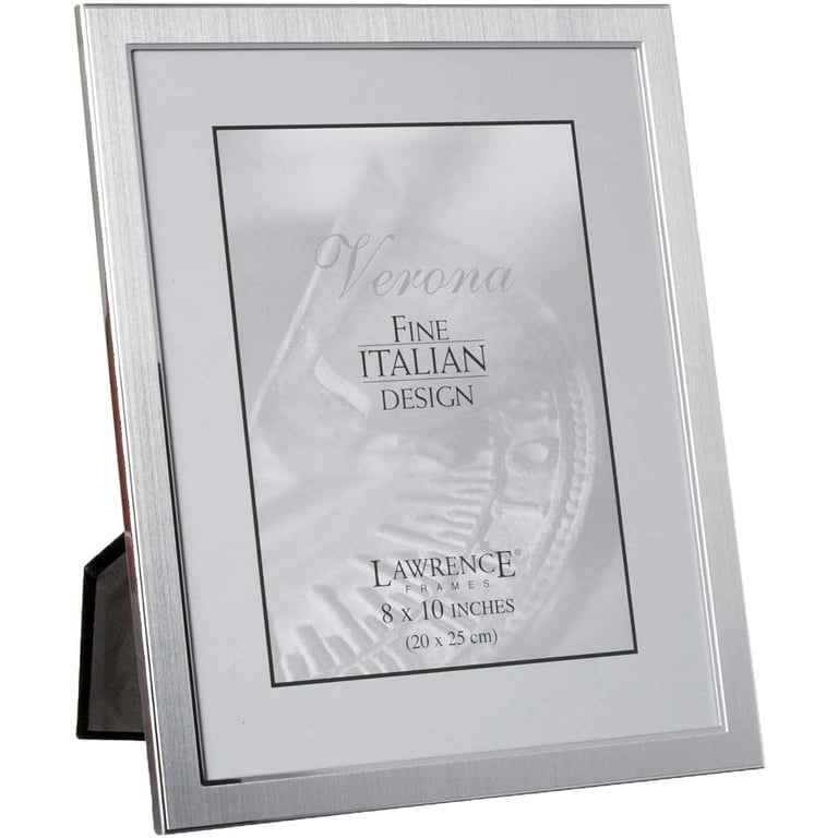 Main view Product Details Lawrence Frames® Satin Silverplate 8x10 frame by Lawrence® — Silver plate style is a blended Italian & contemporary look.Nice black velvet backing with dual easel back for either portrait or landscape tabletop display. Glare resistant glass lens.By Lawrence®. Satin Silverplate 8x10 frame by Lawrence® Lawrence® HOLIDAY CELEBRATION Savings: Buy More / Save More * Add this item to your cart for the full details of this promotion. Conditions may apply. Model #751148050036 List $34.00 You pay $28.95 In stock Ships next business day [?] Your Price Match is Active Your request for a price of $0.00 for a minimum quantity of has been accepted. You have [time] left to purchase this item for $0.00 instead of $28.95 each. Find a Lower Price? We BEAT All Authorized Retailers [?] FEATURESDisplays:8"x10"Material:AluminumOccasion:Anniversary, Bar & Bat Mitzvah, Birthday, Business & office, Baptism + Christening, Congratulations, Corporate gifts, Engagement, Group Events + Parties, Friendship, Get well, Good luck, Grandparent`s Day, Home decorating, Housewarming, Mother`s Day, Teacher gifts, Team & coach gifts, Thank-Motivate-Reward, Celebrating Travels, WeddingStyle:Classic, ContemporaryOrientation:BothBrand:Lawrence Frames®Display Type:Tabletop (or wall w/optional hanger - available separately) This item ships in its own box SHARE THIS ITEM Share on Facebook