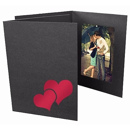 on Black Cardstock Photo Folder Frame'> Main view Sizing Product Details Collectors Gallery Valentine's DOUBLE HEART Red Foil<br>on Black Cardstock Photo Folder Frame — Our photo folder in black, accented with double hearts in red foil. The design is hot stamped (imprinted) onto the front of the folder as shown.Perfect for any type of Valentine's event.Use as is, or personalize by adding your company name, event, organization and/or logo.Terrific look and feel with linen weave finish, deckled edges. Plain window border.Photo easily slides in from the side for convenient event assembly with your prints.Frame displays a 4" x 6" print or photo.See Suggested Accessories below for matching envelopes (not required). Valentine's DOUBLE HEART Red Foil on Black Cardstock Photo Folder Frame Model #52053230 $19.50 ( set of 25 / $0.78 ea ) This item can be expected to ship by 11/04/2025. Order now by clicking ADD TO CART (below); you are only charged when we actually ship. Or, Click here to be automatically notified when it comes back in stock. Your Price Match is Active Your request for a price of $0.00 for a minimum quantity of has been accepted. You have [time] left to purchase this item for $0.00 instead of $0.78 each. Find a Lower Price? We BEAT All Authorized Retailers [?] FEATURESDisplays:4"x6"Material:Card-stockFinish:Black, RedOccasion:Group Events + Parties, Romantic, Valentine`s DayStyle:Romantic, Eco-Friendly-RecycledOrientation:Vertical OnlyDisplay Type:not applicable n/a SHARE THIS ITEM Share on Facebook