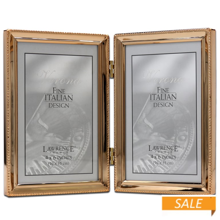 Main view Product Details Lawrence Frames® Gold plated hinged 4x6 double w/caviar bead trim — A polished gold plate frame, nicely crafted with invisible seams and corners.Attractively backed for wonderful desk appeal.Glare resistant glass lens. Brass hinges for smooth closing.By Lawrence®. Click The Lawrence Frame collection to shop the entire line. Gold plated hinged 4x6 double w/caviar bead trim Model #751148078962 List $35.00 You pay $17.90 In stock Ships next business day [?] Your Price Match is Active Your request for a price of $0.00 for a minimum quantity of has been accepted. You have [time] left to purchase this item for $0.00 instead of $17.90 each. Find a Lower Price? We BEAT All Authorized Retailers [?] FEATURESDisplays:4"x6"Material:Gold plateFinish:GoldOccasion:Anniversary, Birthday, Good luck, Retirement, Romantic, WeddingStyle:Classic, Traditional, RomanticOrientation:Vertical OnlyBrand:Lawrence Frames®Display Type:Desktop or Wall This item ships in its own box SHARE THIS ITEM Share on Facebook