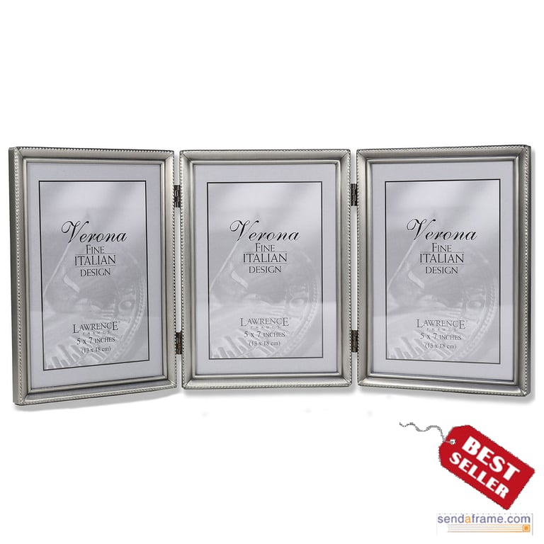 Main view Product Details Lawrence Frames® Satin antiqued pewter-look hinged 5x7 triple w/caviar bead trim — Beaded antiqued pewter frame is beautifully crafted with invisible seams and corners.Tightly joined seams and corners are just part of its appeal. Nicely backed for a wonderful table-top accessory. Glare resistant glass lenses. Edge measures 3/8" all around. Wall mounts included for easy hanging.By Lawrence Frames®, crafting fine frames for generations. Satin antiqued pewter-look hinged 5x7 triple w/caviar bead trim Model #751148035118 List $55.00 You pay $41.95 This item IS in stock and can be expected to ship 01/21/2026 In stock Your Price Match is Active Your request for a price of $0.00 for a minimum quantity of has been accepted. You have [time] left to purchase this item for $0.00 instead of $41.95 each. Find a Lower Price? We BEAT All Authorized Retailers [?] FEATURESDisplays:5"x7"Material:Pewter (plate)Finish:SilverOccasion:Anniversary, Baby shower, Business & office, Good luck, Graduation, Home decorating, Housewarming, Mother`s Day, Retirement, Romantic, Thank-Motivate-Reward, Celebrating Travels, BirthdayStyle:Antique, Classic, Traditional, Romantic, Unique | LimitedOrientation:Vertical OnlyBrand:Lawrence Frames®Display Type:Desktop or Wall Approx. Overall Dimensions:15 5/8"x7 3/16"x1/2" This item ships in its own box SHARE THIS ITEM Share on Facebook