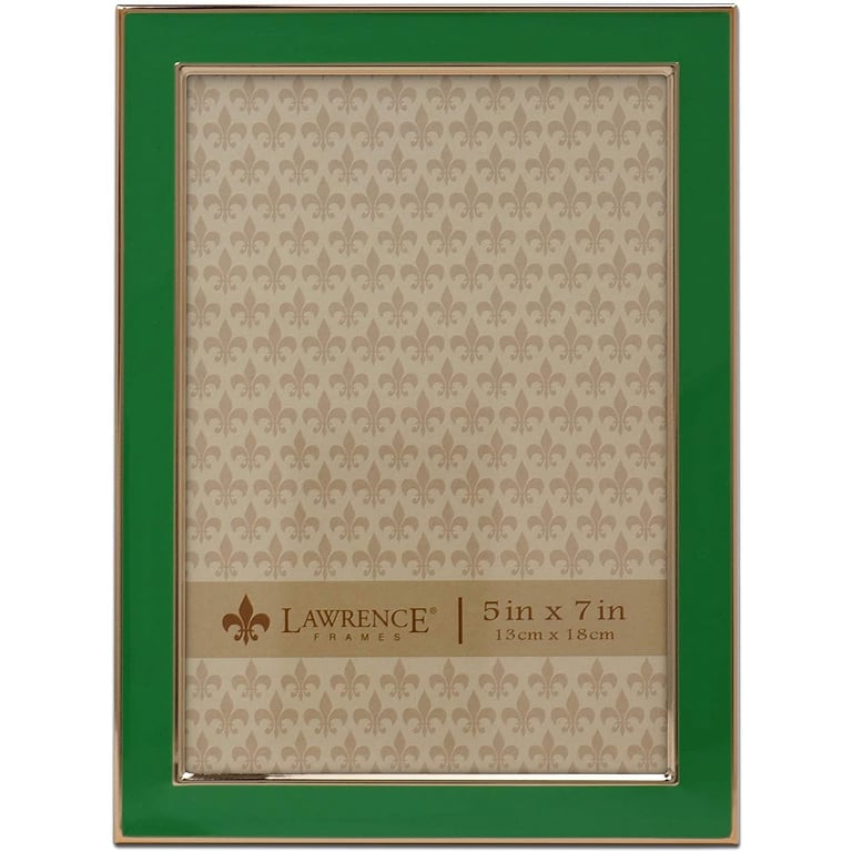 Back to results Scroll Items 6454 of 11255 Family Members 8"x10" - Green Enamel w/Gold Trim $34.95 4"x6" - Green Enamel w/Gold Trim $22.95 4"x4" - Green Enamel w/Gold Trim $17.95 Main view addl view Product Details Lawrence Frames® Green Enamel w/Gold Trim 5x7 by Lawrence — A high quality goldplated frame with polished green enamel panel. This silver plated and lacquer coated frame has a beautiful lustrous finish. includes a high quality black velvet backing with an easel for vertical or horizontal table top display, and hangers for vertical or horizontal wall mounting. Heavy weight metal picture frame is made with exceptional workmanship and comes individually boxed. From Lawrence®, maker of fine frames for generations. Green Enamel w/Gold Trim 5x7 by Lawrence Model #751148079532 List $35.00 You pay $25.95 This item IS in stock and can be expected to ship 11/26/2025 Your Price Match is Active Your request for a price of $0.00 for a minimum quantity of has been accepted. You have [time] left to purchase this item for $0.00 instead of $25.95 each. Find a Lower Price? We BEAT All Authorized Retailers [?] Approx. Overall Dimensions:5 3/4"x7 3/4"x5/8" This item ships in its own box SHARE THIS ITEM Share on Facebook