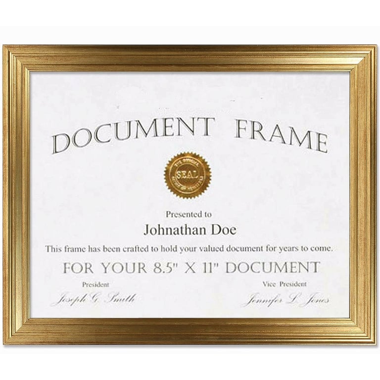 Main view Product Details Lawrence Frames® SUTTER Burnished Gold composite-wood 8½x11 frame — High quality burnished gold composite picture frame specially sized for certificates or diplomas. Comes with an easel for table top display, and hangers for easy wall mounting. High quality black velvet backing. Picture frame comes with glass to protect your photo, and is individually boxed. Decorative picture frame Black velvet backing Vertical or horizontal tabletop display or can be hung on a wall with installed hangers Wipe clean with dry cloth, glass included By Lawrence Frames®, crafting fine frames for generations. SUTTER Burnished Gold composite-wood 8½x11 frame Model #751148069991 List $26.50 You pay $20.95 This item IS in stock and can be expected to ship 01/20/2026 Your Price Match is Active Your request for a price of $0.00 for a minimum quantity of has been accepted. You have [time] left to purchase this item for $0.00 instead of $20.95 each. Find a Lower Price? We BEAT All Authorized Retailers [?] FEATURESDisplays:8.50"x11"Material:Wood (mdf/engineered)Finish:GoldOccasion:Business & office, Congratulations, Corporate gifts, Home decorating, Teacher gifts, Team & coach gifts, Celebrating TravelsStyle:Classic, TraditionalBrand:Lawrence Frames®Display Type:Desktop or Wall Approx. Overall Dimensions:12 13/16"x10 3/16"x13/16" This item ships in its own box SHARE THIS ITEM Share on Facebook