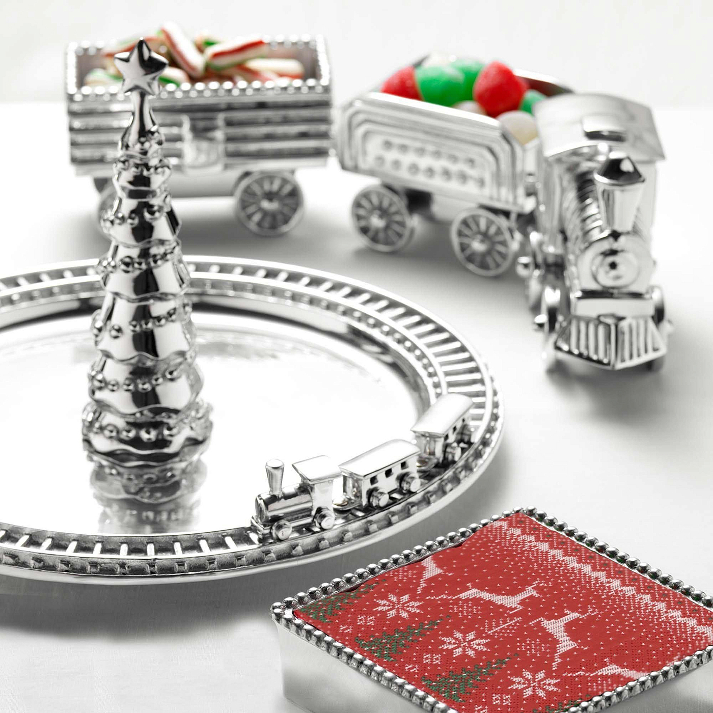Main view Catalog photo of set (see FAMILY) Product Details Mariposa® The <i><b>Totally Original</b></i> TRAIN SERVER by Mariposa® — Add magic to the holidays with the TRAIN SERVER This handcrafted, collectible 3-piece server set includes the train engine and two cars - all large size with moving wheels. Delight your holiday guests with this whimsical piece on your holiday table. Fills with your favorite goodies. Material: Recycled Sandcast Aluminum Dimensions: 16¾in L x 3in W x 3½in H Designer: Michael Updike Mariposa model / item #: 1029 Recommended care: Wash by hand with mild dishwashing soap and dry immediately. The Totally Original TRAIN SERVER by Mariposa® Mariposa® WINTER CELEBRATION Savings - Buy More / Save More * Add this item to your cart for the full details of this promotion. Conditions may apply. Model #808813085005 $325.00 1 available to ship, more on the way. In stock Ships next business day Your Price Match is Active Your request for a price of $0.00 for a minimum quantity of has been accepted. You have [time] left to purchase this item for $0.00 instead of $325.00 each. Find a Lower Price? We BEAT All Authorized Retailers [?] FEATURESMaterial:AluminumFinish:SilverOccasion:Hanukkah, Christmas, Weekend Host GiftsStyle:Contemporary, Santa Fe, Shabby Chic, Sports & leisure, Eco-Friendly-Recycled, ModernBrand:Mariposa®Display Type:Desktop Only Approx. Overall Dimensions:16 3/4"x3 1/2"x3" This item ships in its own box SHARE THIS ITEM Share on Facebook