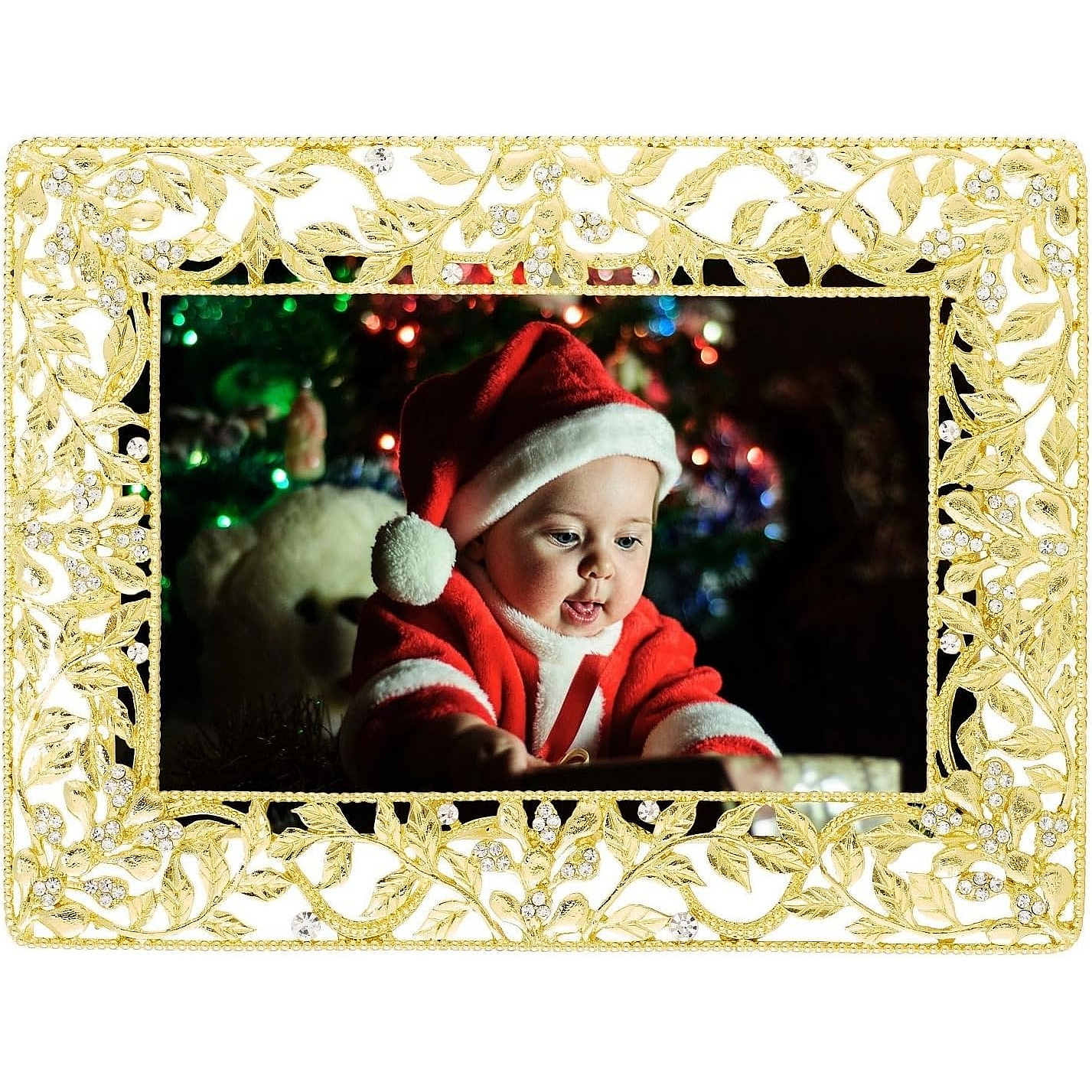 Elegant champagne moiré silk back, with easel designed for vertical or horizontal placement. Tarnish resistant. Signature luxury gift box included.